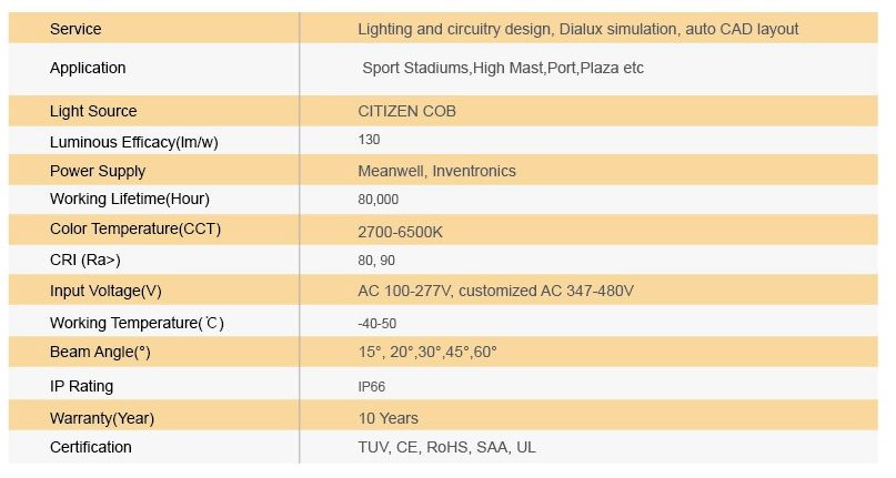 We have a professional engineer team is always ready to provide you the DIALux simulation, the lighting engineers use to calculate and visualize the stadium lighting requirements for specific applications. It can let you know which type of stadium lights are needed, the number of stadium lights fixtures and wattage for each, and how the light project angle. It also provides a visualization of the stadium lighting coverage. Welcome to send us your project information to [email protected], then we can provide you the best light solution and budget quotation.